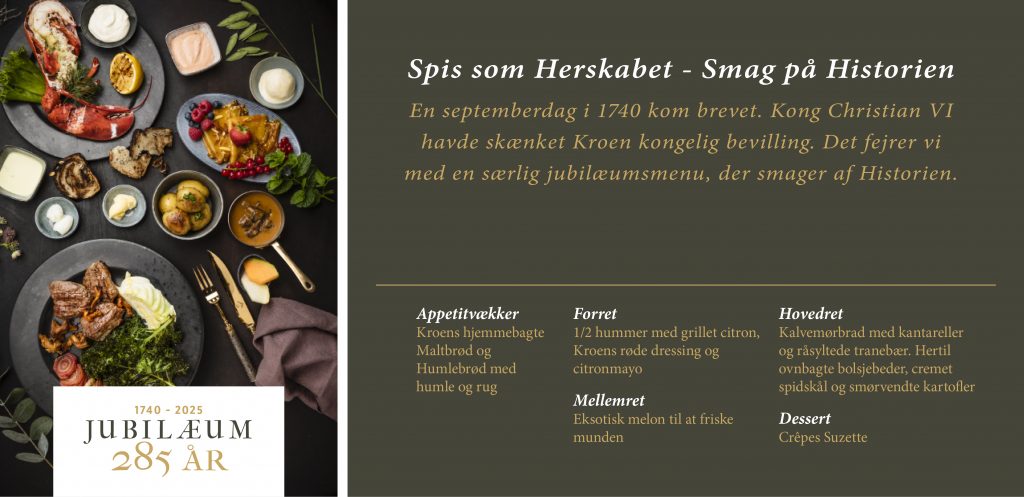 Kroens Jubilæumsmenu “Smag på Historien” kan bestilles ved min. 10 kuverter og skal forudbestilles senest dagen før.