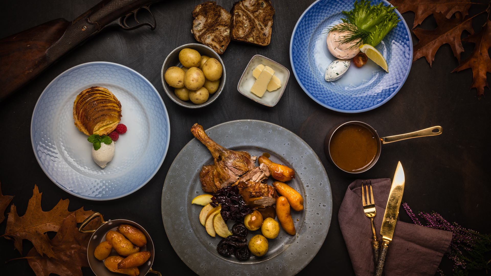 Vi serverer en 3-retters Mortens Aften-menu med sprød andesteg og alt hvad dertil hører.