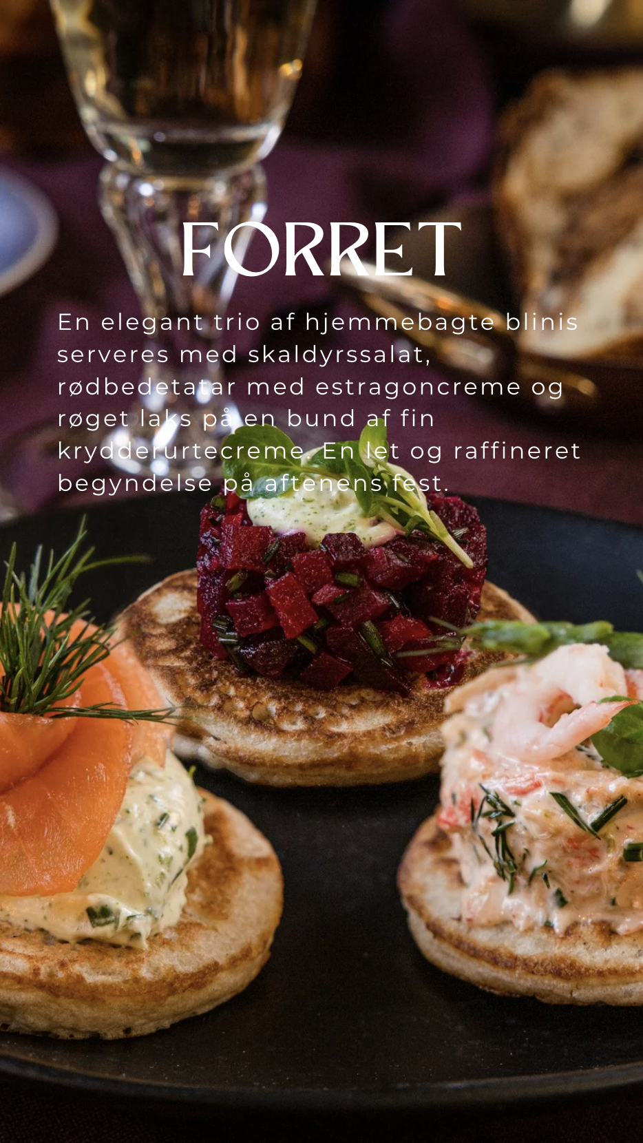 FORRET En elegant trio af hjemmebagte blinis serveres med skaldyrssalat, rødbedetatar med estragoncreme og røget laks på en bund af fin krydderurtecreme.