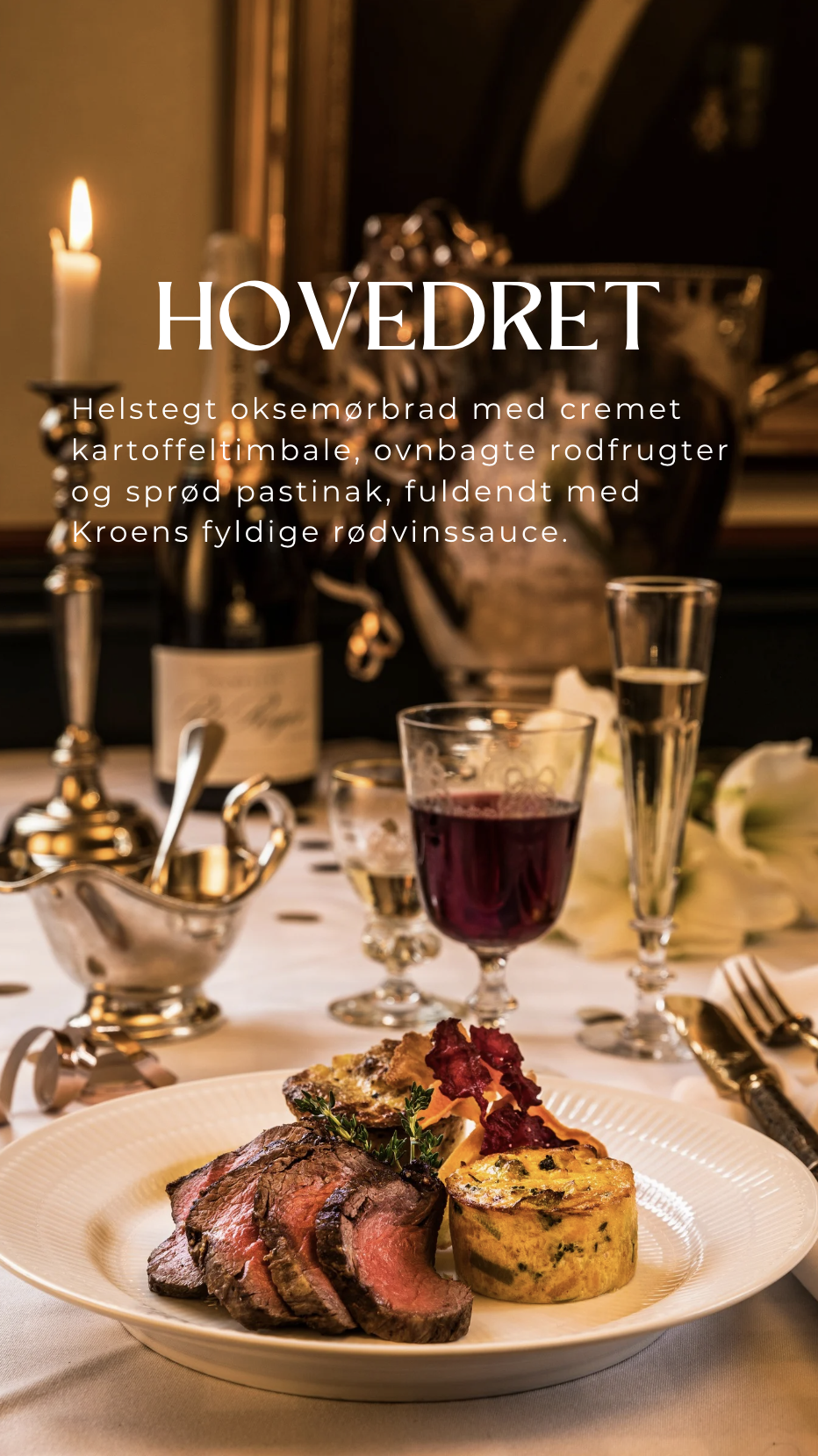 HOVEDRET Helstegt oksemørbrad med cremet kartoffeltimbale, ovnbagte rodfrugter og sprød pastinak, fuldendt med Kroens fyldige rødvinssauce.