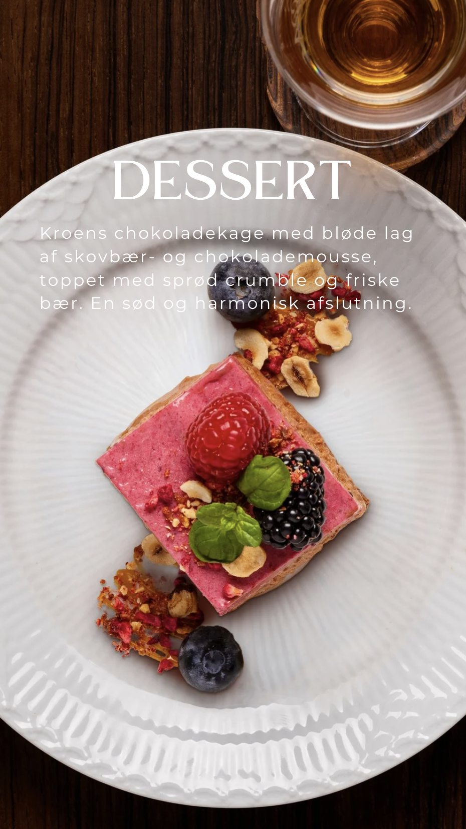 DESSERT Kroens chokoladekage med bløde lag af skovbær- og chokolademousse, toppet med sprød crumble og friske bær. En sød og harmonisk afslutning.