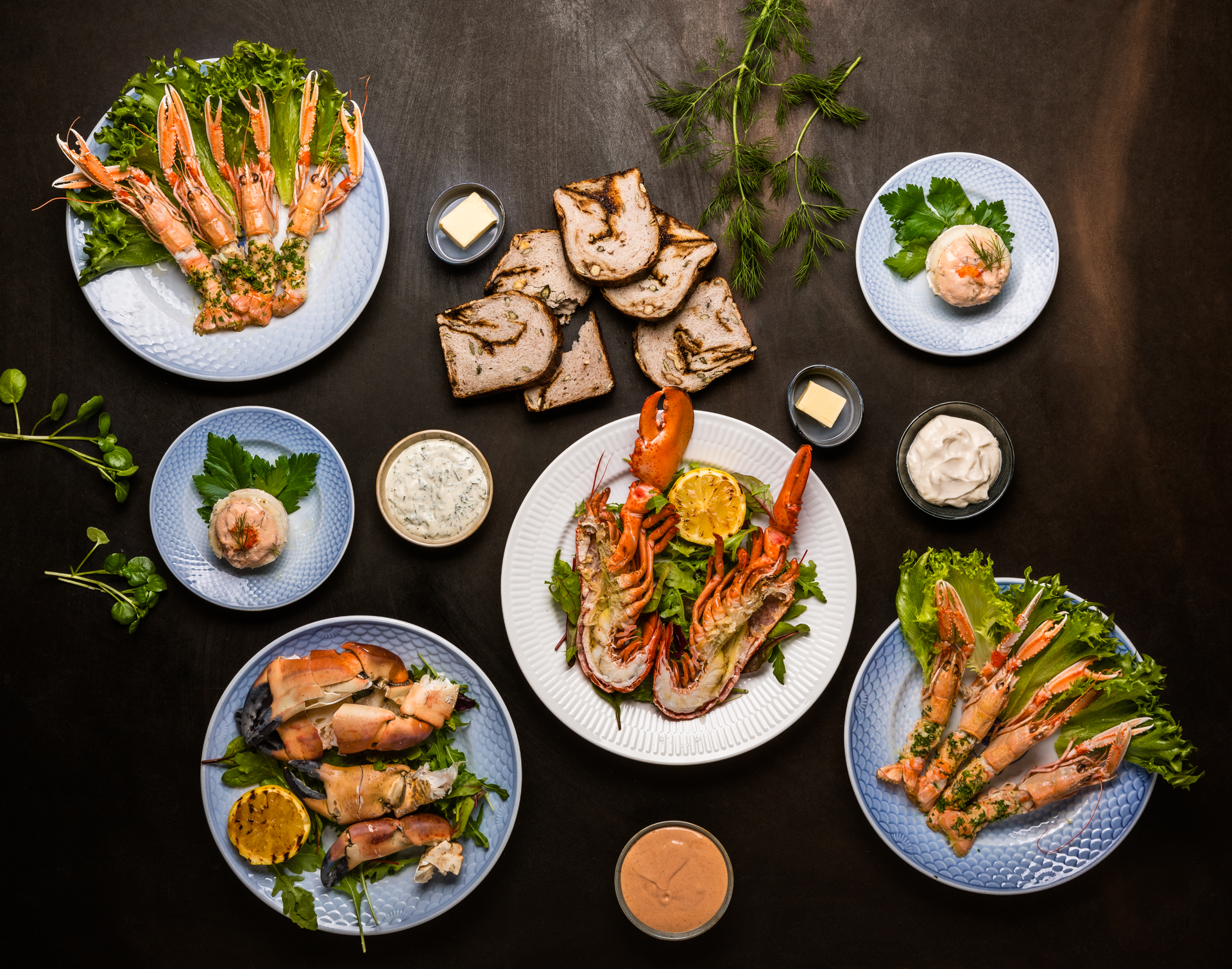 2 Halve hummere 8 Jomfruhummere 4 Krabbekløer 2 Fisk Cardinal – laksefarseret rødtungefilet med krebsehaler og rejer, tilsmagt med trøffel 3 af Kroens hjemmelavede dressinger – citrus, thousand island og krydderurtedressing Grillet citron Kroens hjemmebagte maltbrød