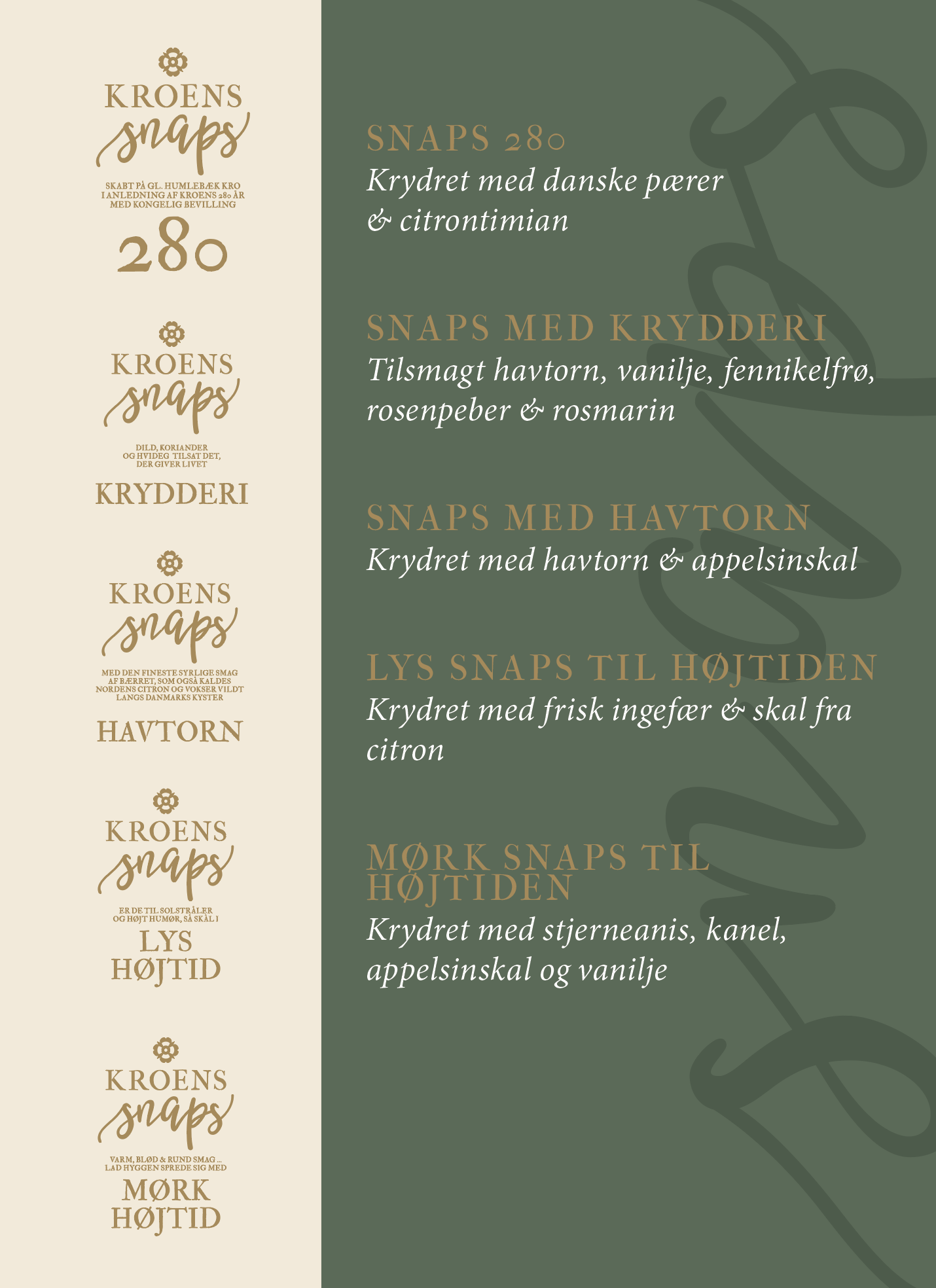I Kroens hemmelige snapseskuffe ligger en stor samling forskellige snapse og brændevine på rad og række og med hver sin karakter. Den stærke drik har alle dage været en vigtig del af stedets servering, og bør traditionen tro være en del af ethvert veldækket frokostbord.